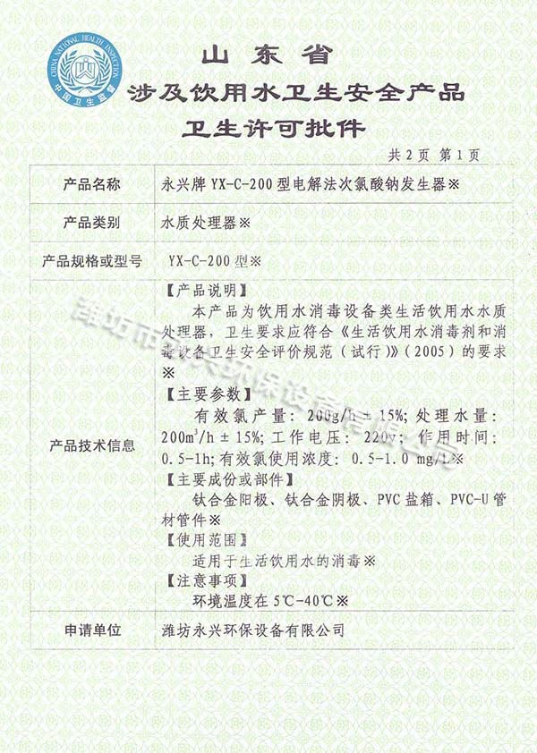 電解法次氯酸鈉發生器涉及飲用水衛生許可批件--詳情說明